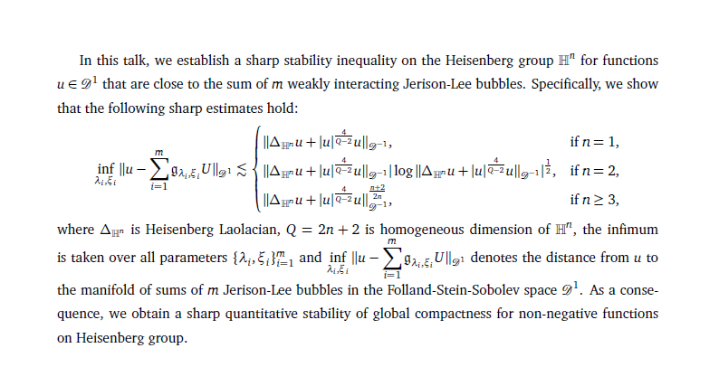 讲座题目: Sharp Stability of Global Compactness on the Heisenberg Group